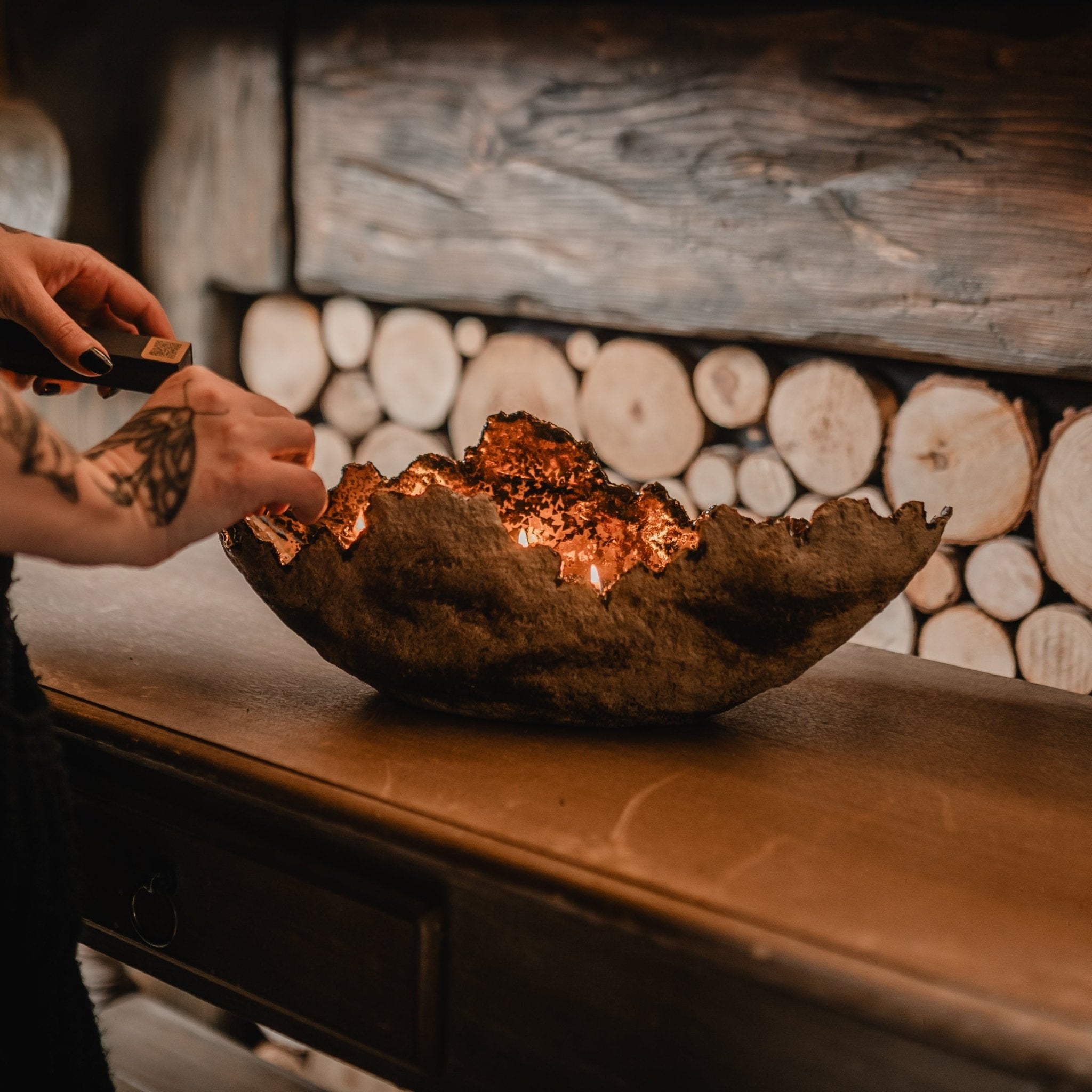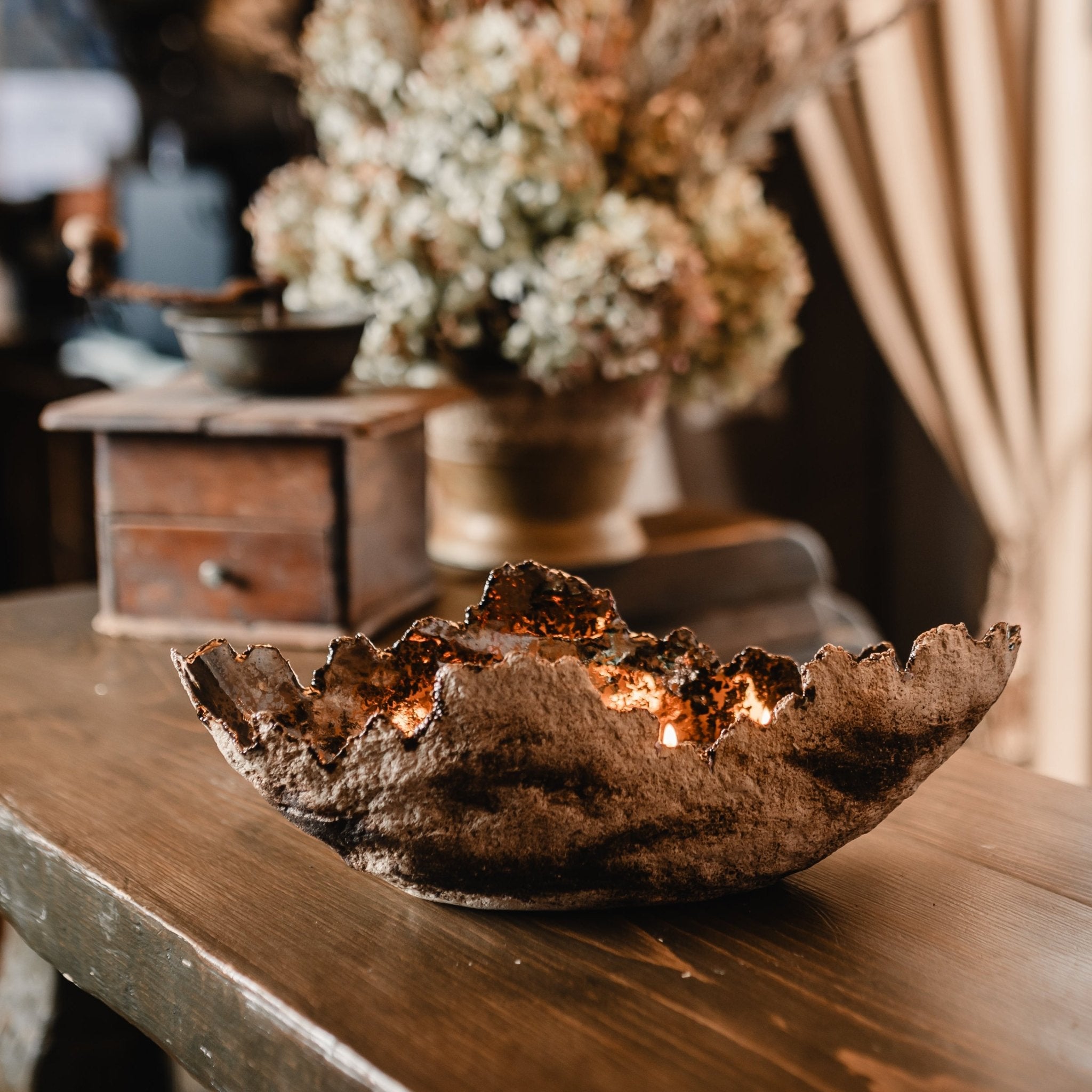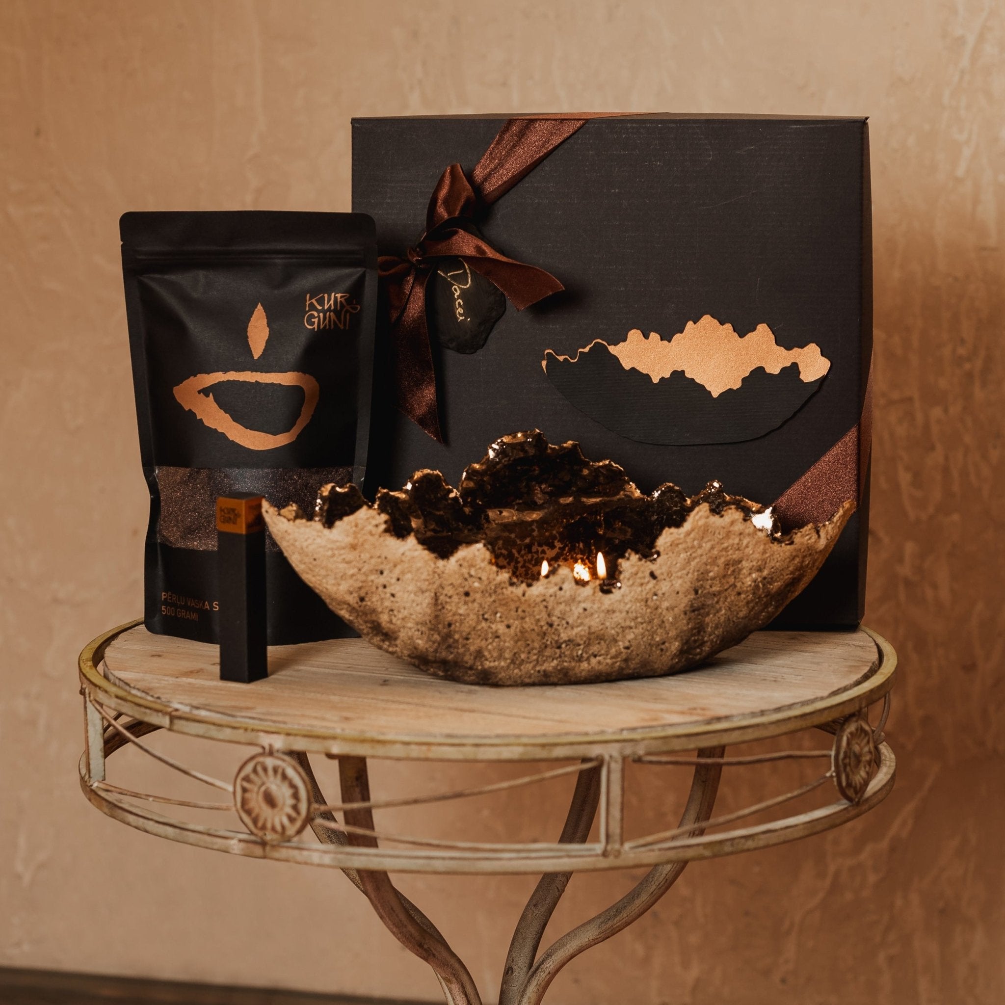 Roku darbs - akmensmasa ar krikumainu ārpusi un zeltainu bronzas glazūru iekšpusē. Kalpo kā elegants svečturis un dekoratīvs elements uzglabāšanai (piemēram, augļu).