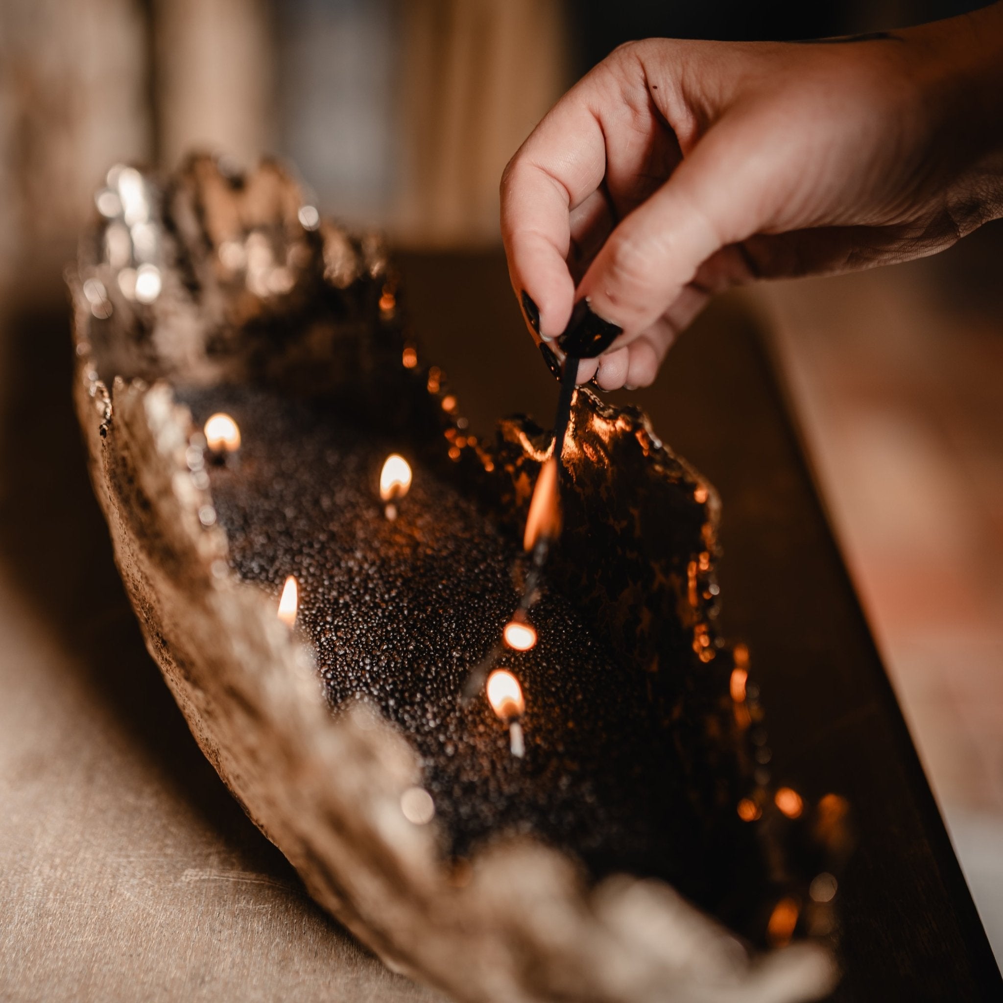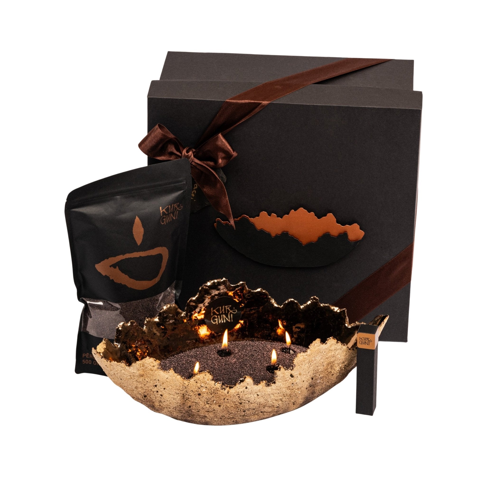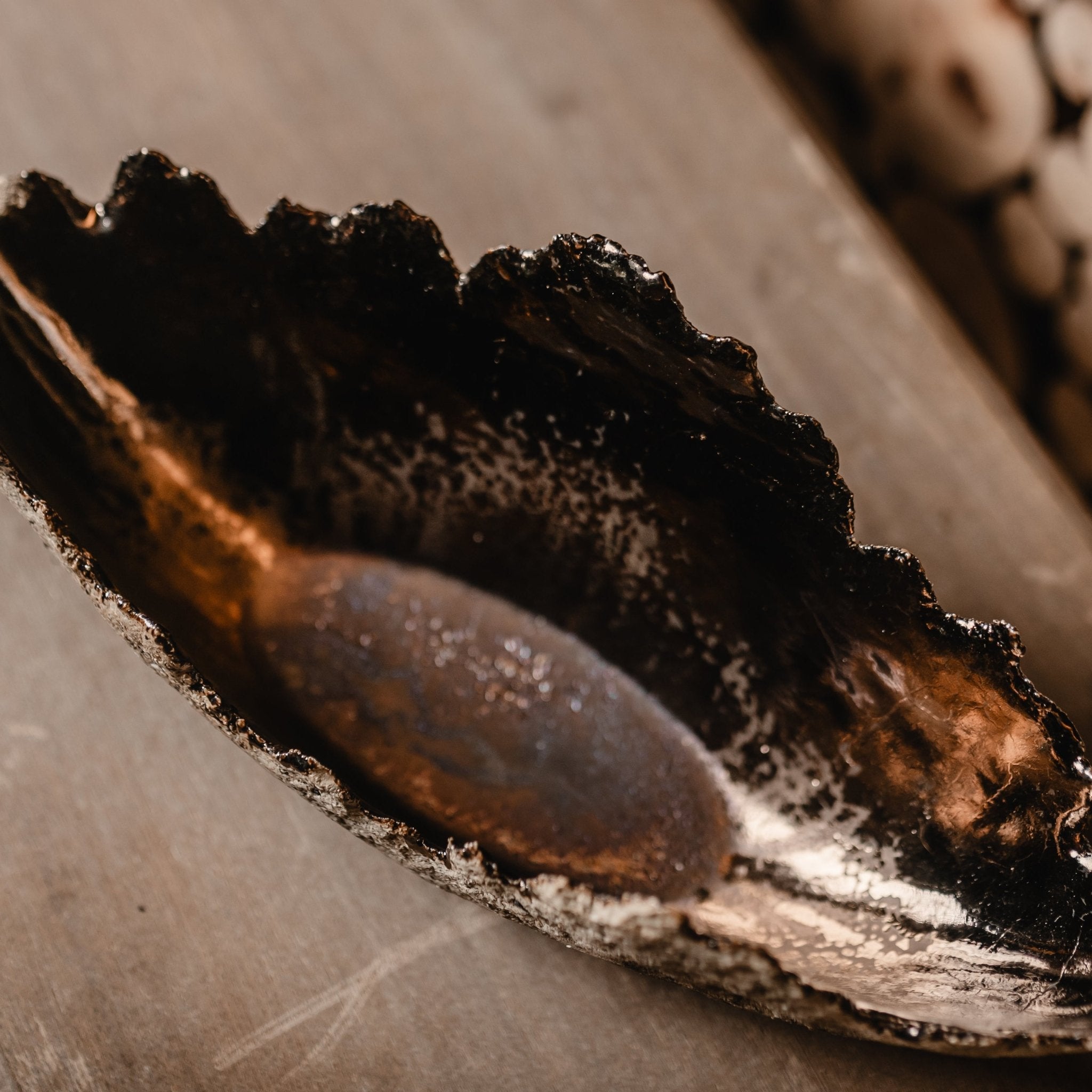 Roku darbs - akmensmasa ar krikumainu ārpusi un zeltainu bronzas glazūru iekšpusē. Kalpo kā elegants svečturis un dekoratīvs elements uzglabāšanai (piemēram, augļu).