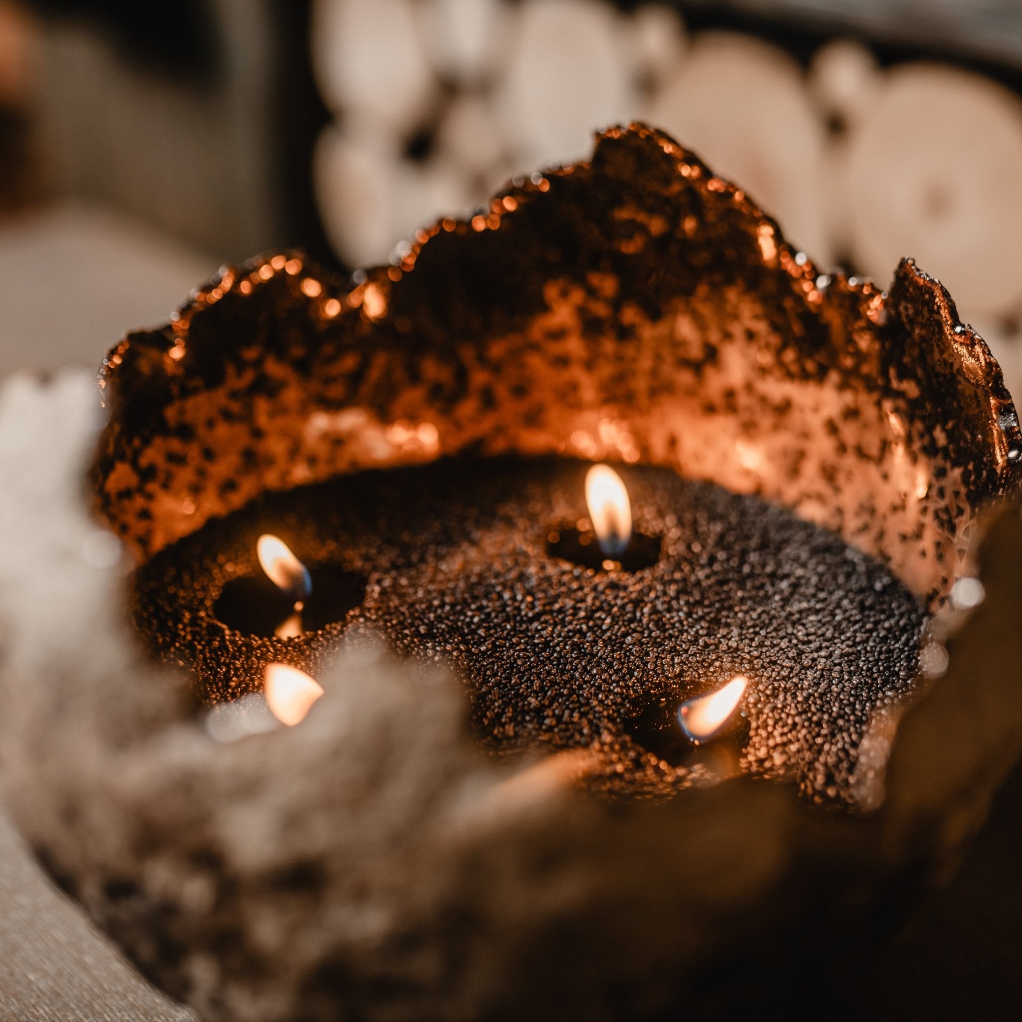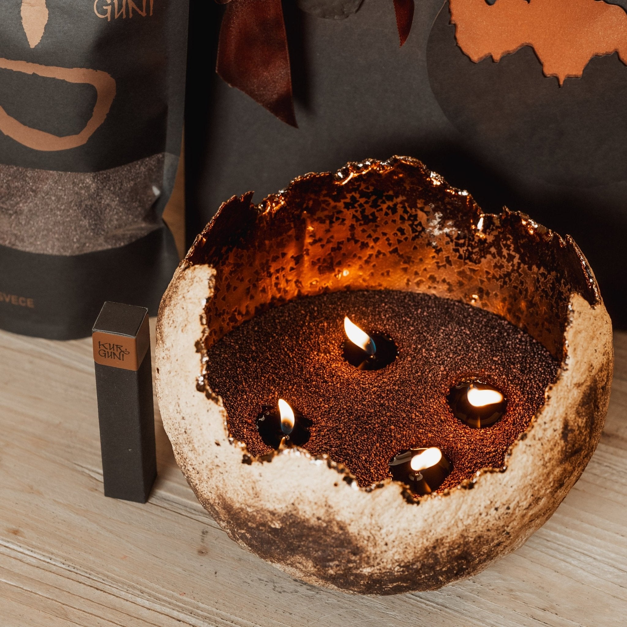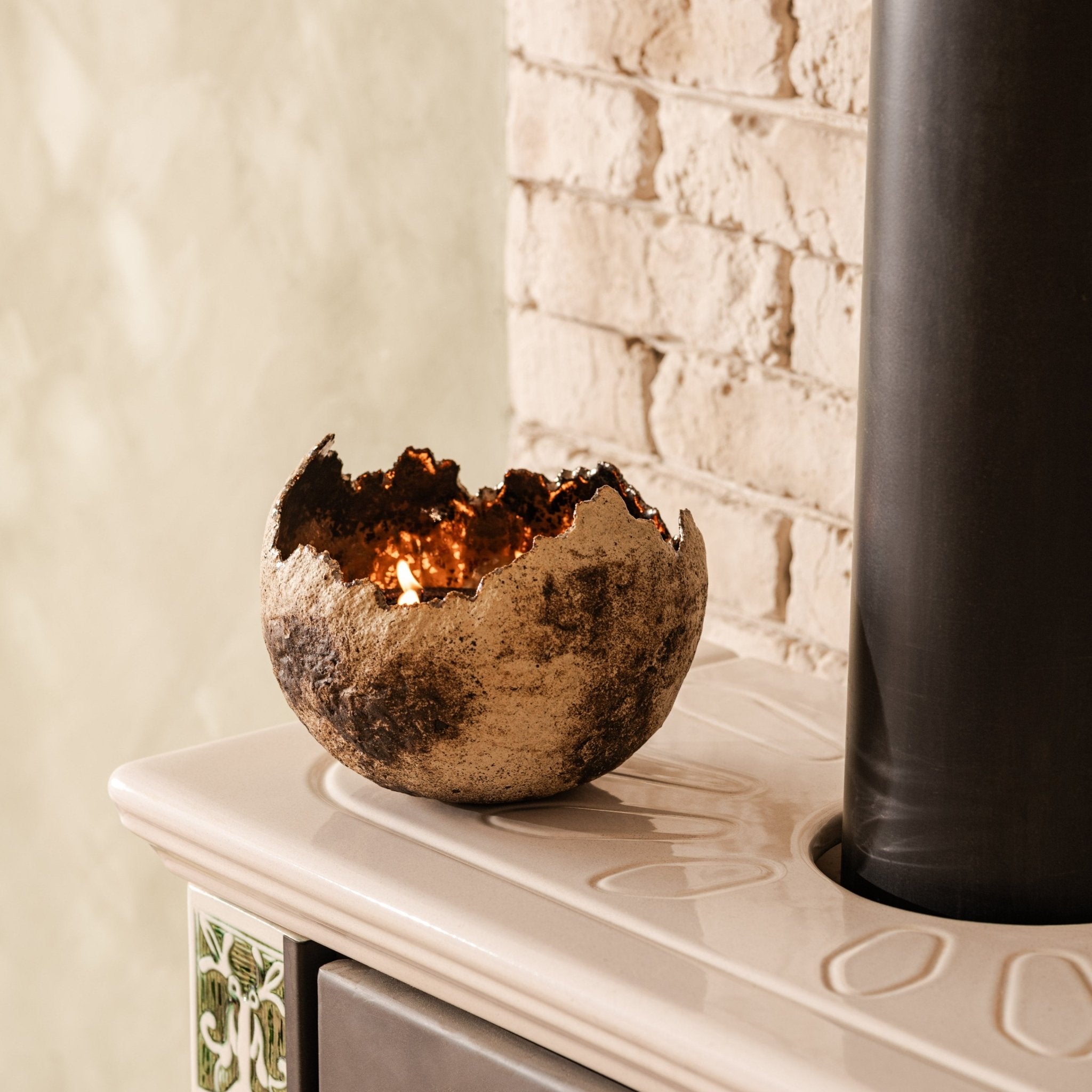 Roku darbs - akmensmasa ar krikumainu ārpusi un zeltainu bronzas glazūru iekšpusē. Kalpo kā elegants svečturis un dekoratīvs elements uzglabāšanai (piemēram, augļu).