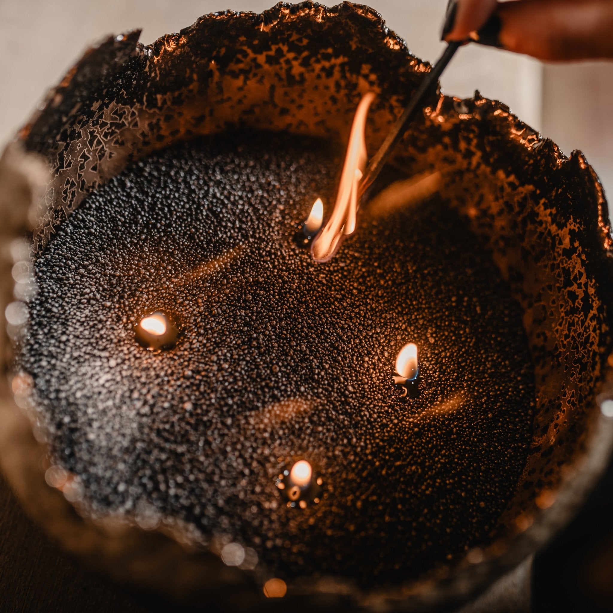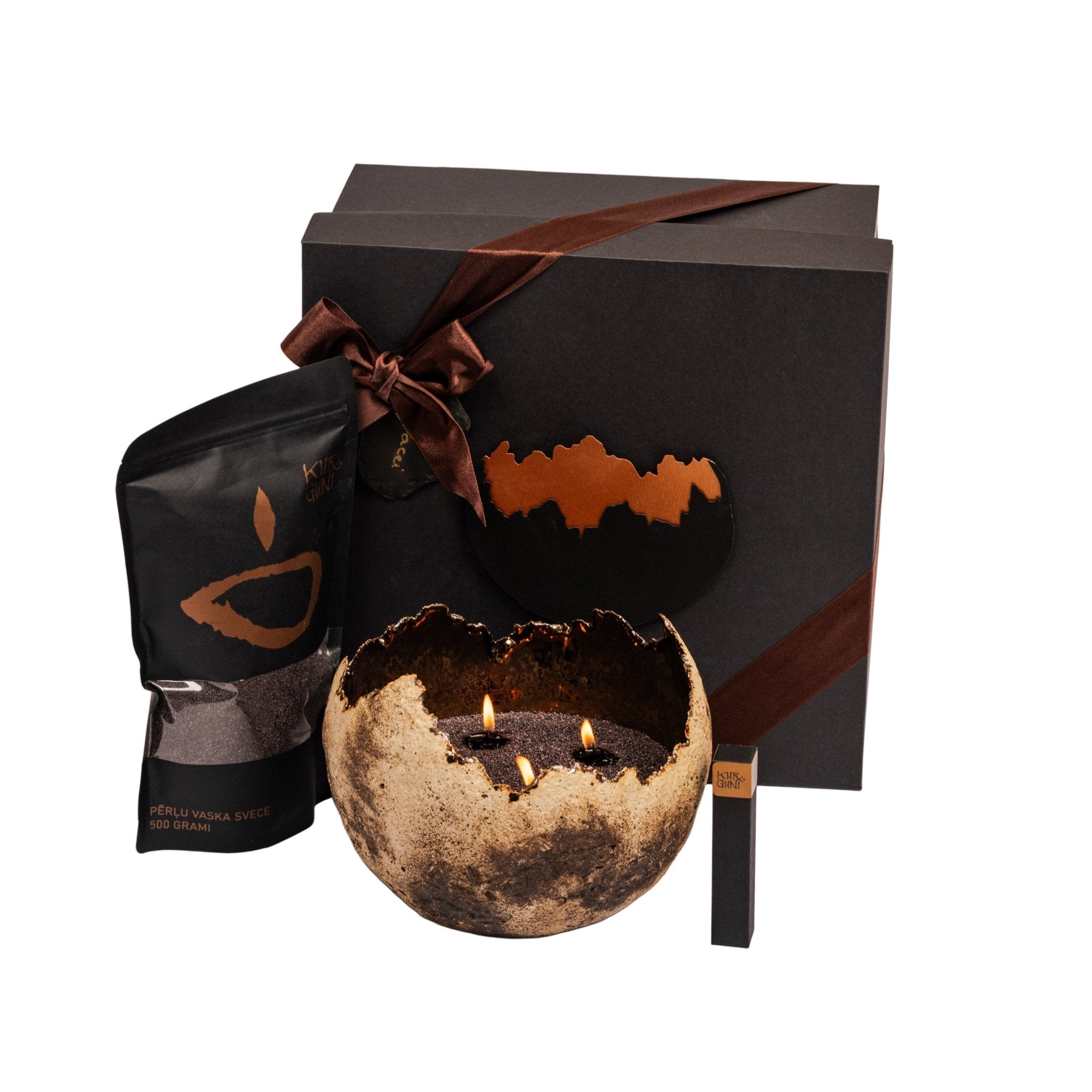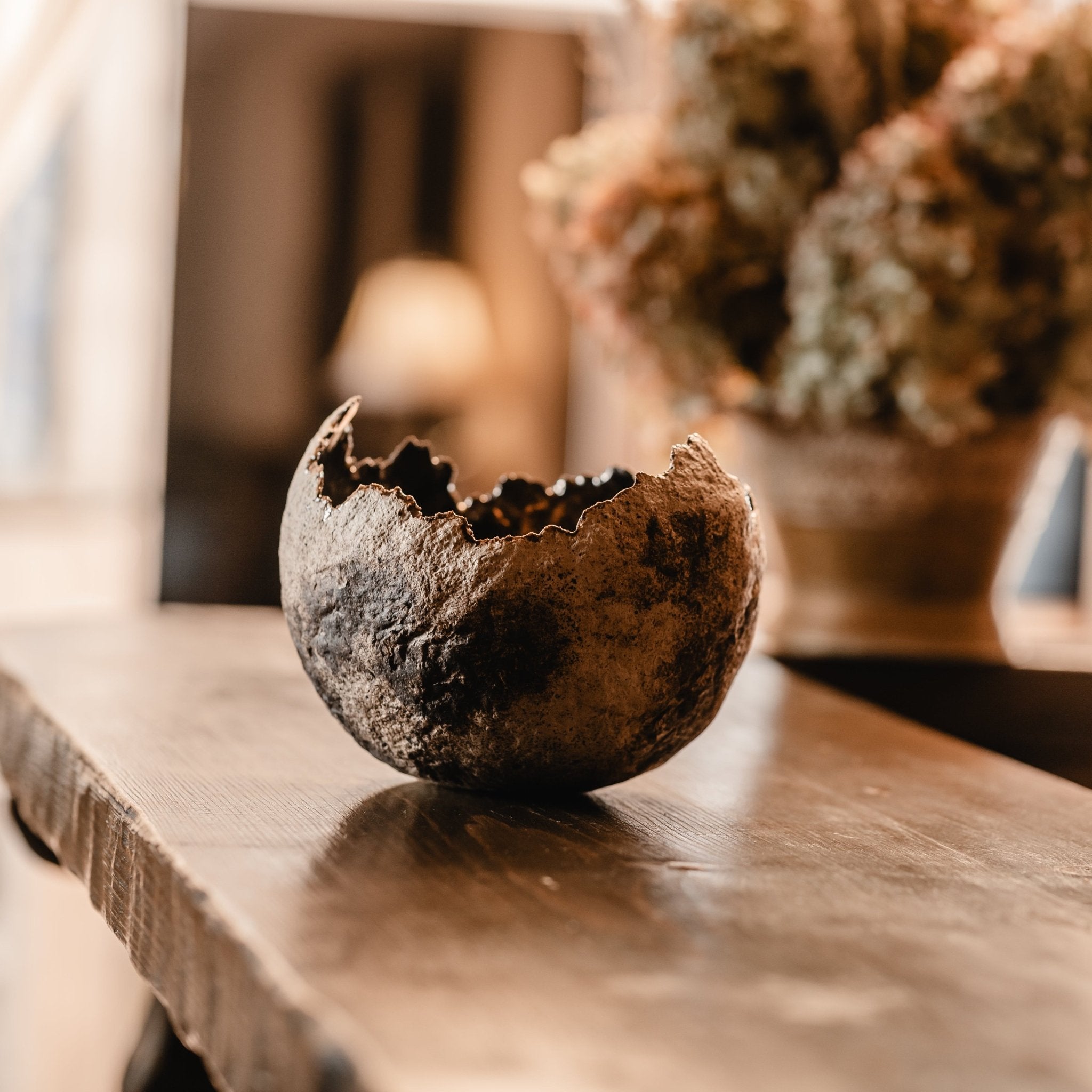 Roku darbs - akmensmasa ar krikumainu ārpusi un zeltainu bronzas glazūru iekšpusē. Kalpo kā elegants svečturis un dekoratīvs elements uzglabāšanai (piemēram, augļu).
